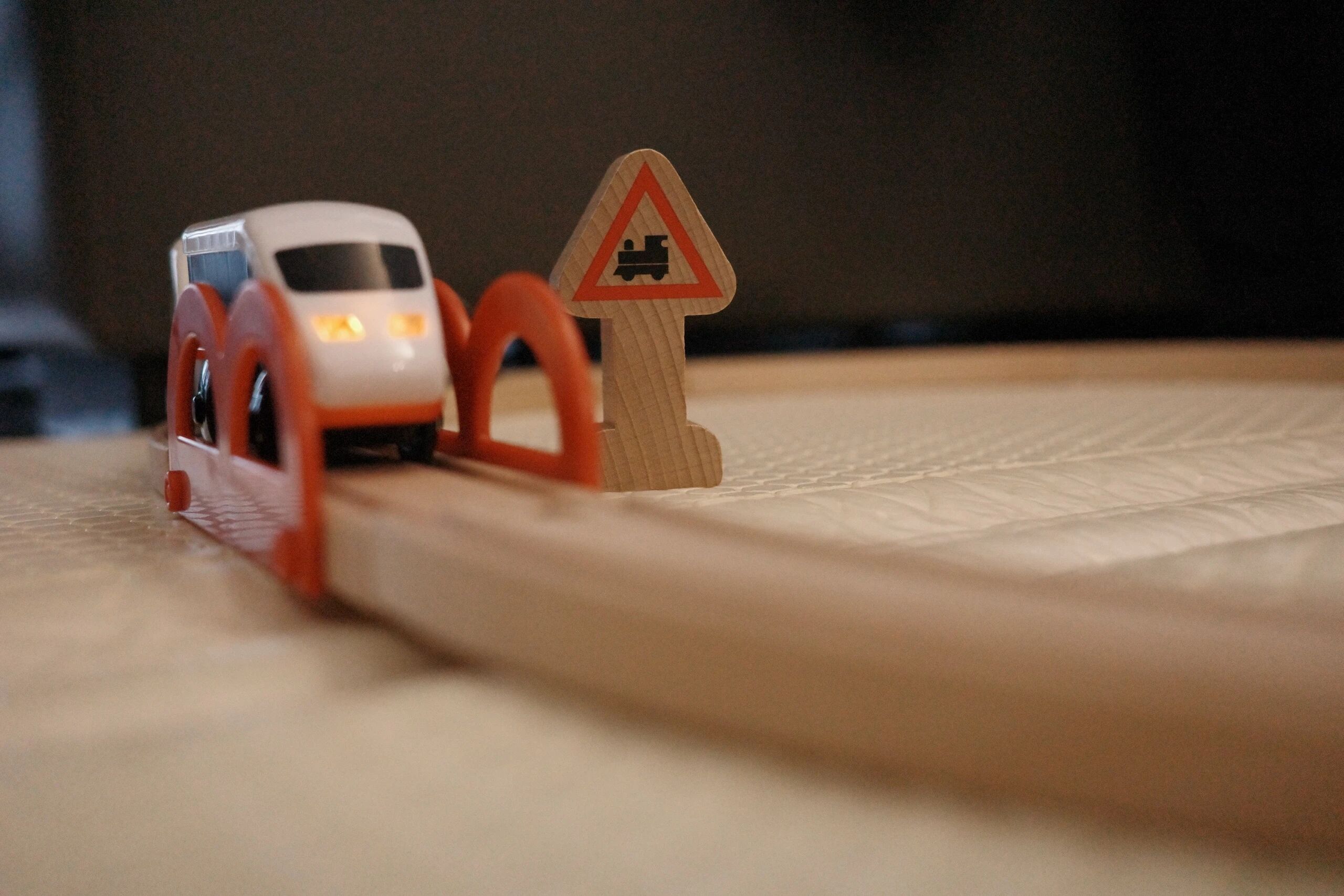 最近我太太给小孩买了套宜家的小火车玩具,有十来块木头轨道,还有些小树木,小房子积木的配件,可以自己拼接。